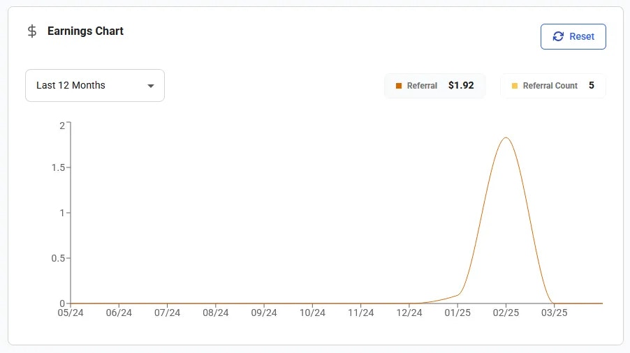 The Earnings page gives you a transparent view of your referral program performance and accumulated rewards. Here’s what each section means:
