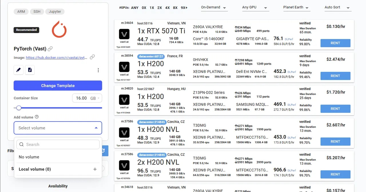 3. Click Rent button to launch your instance along with the volume. Once the instance is running, your volume will be automatically mounted and available inside the container at the /data directory.