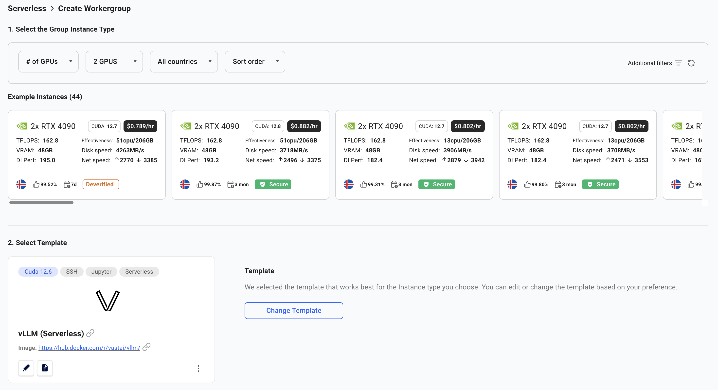 You will now be taken to the Create Workergroup page.Select the vLLM (Serverless) template, which comes pre-configured with: